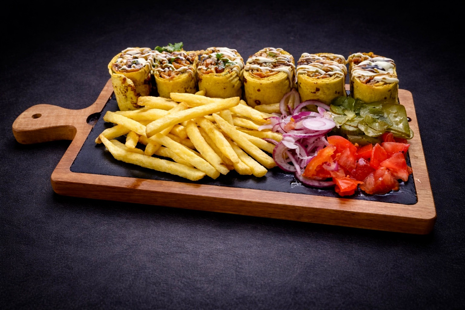 Lipie cu curcuma, carne de vita-curcan, cartofi, sos de usturoi, castraveți, ceapă, roșii, sos de rodie